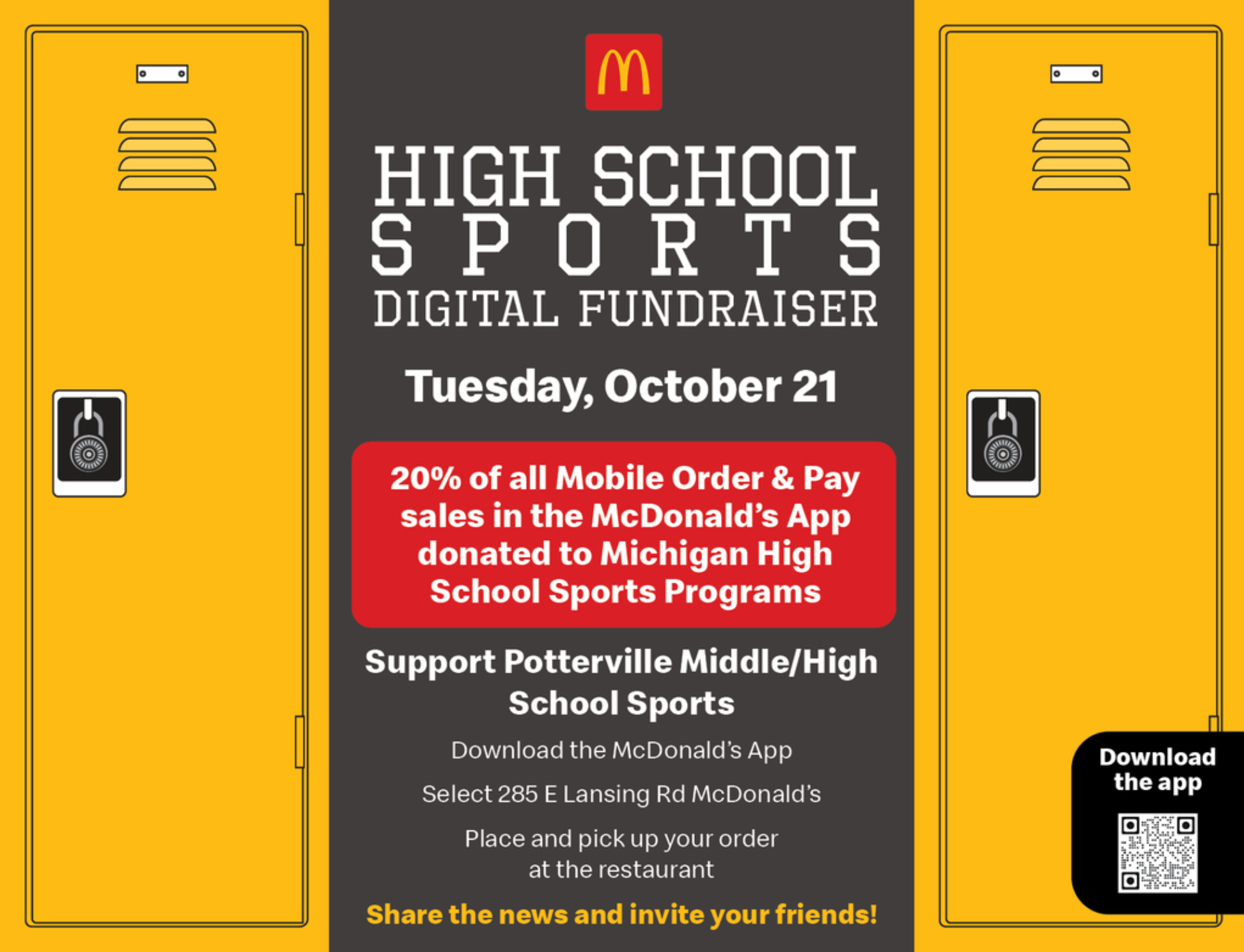 20% of all Mobile Order & Pay sales in the McDonald's App donated to Michigan High School Sports Programs. Support Potterville Middle/High School Sports!